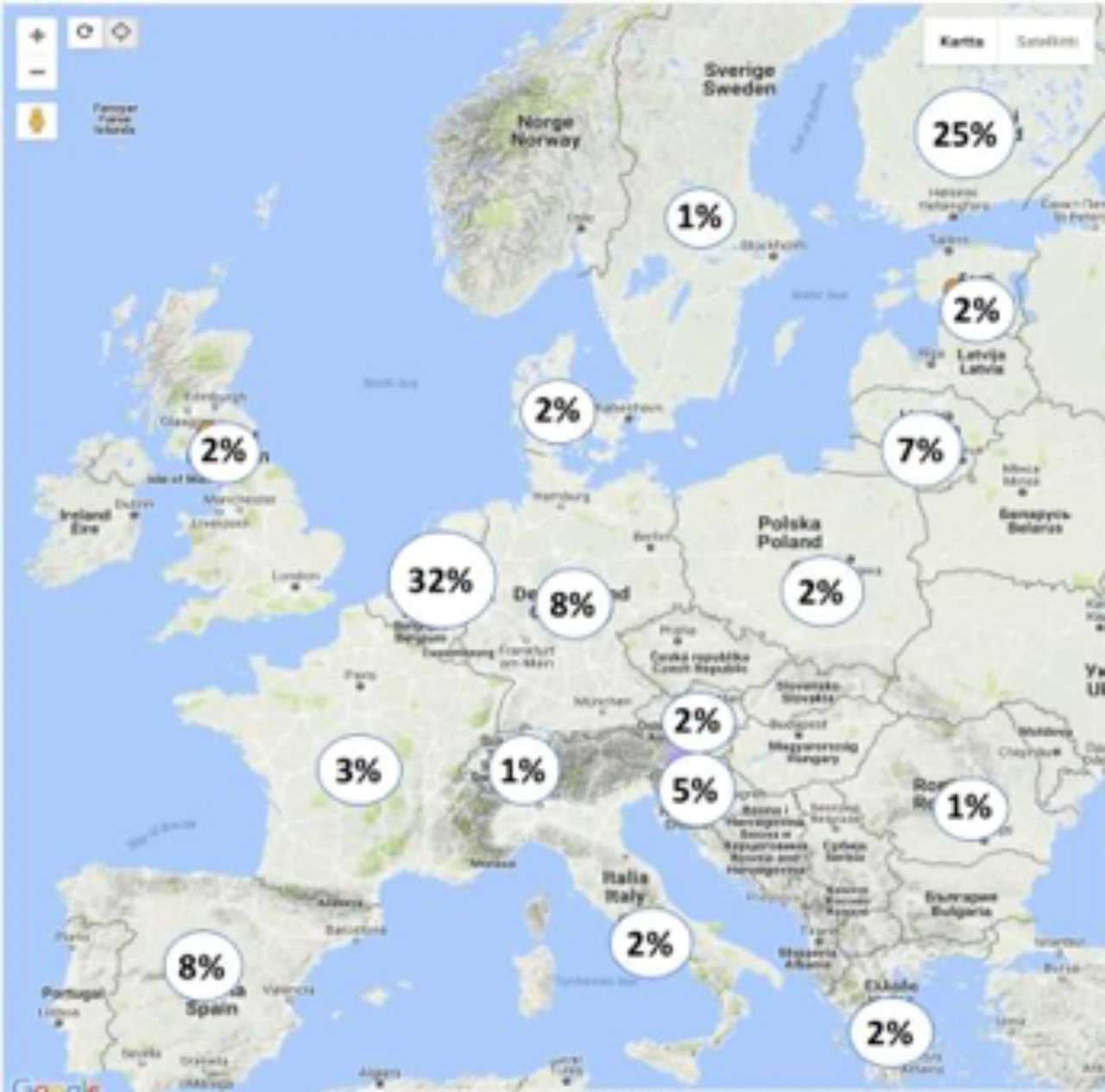 Over the four-year research period more than 1.500 SME's from thirteen European countries responded to surveys about Business Model Innovation. The image shows the spread of the interviews throughout the different European countries