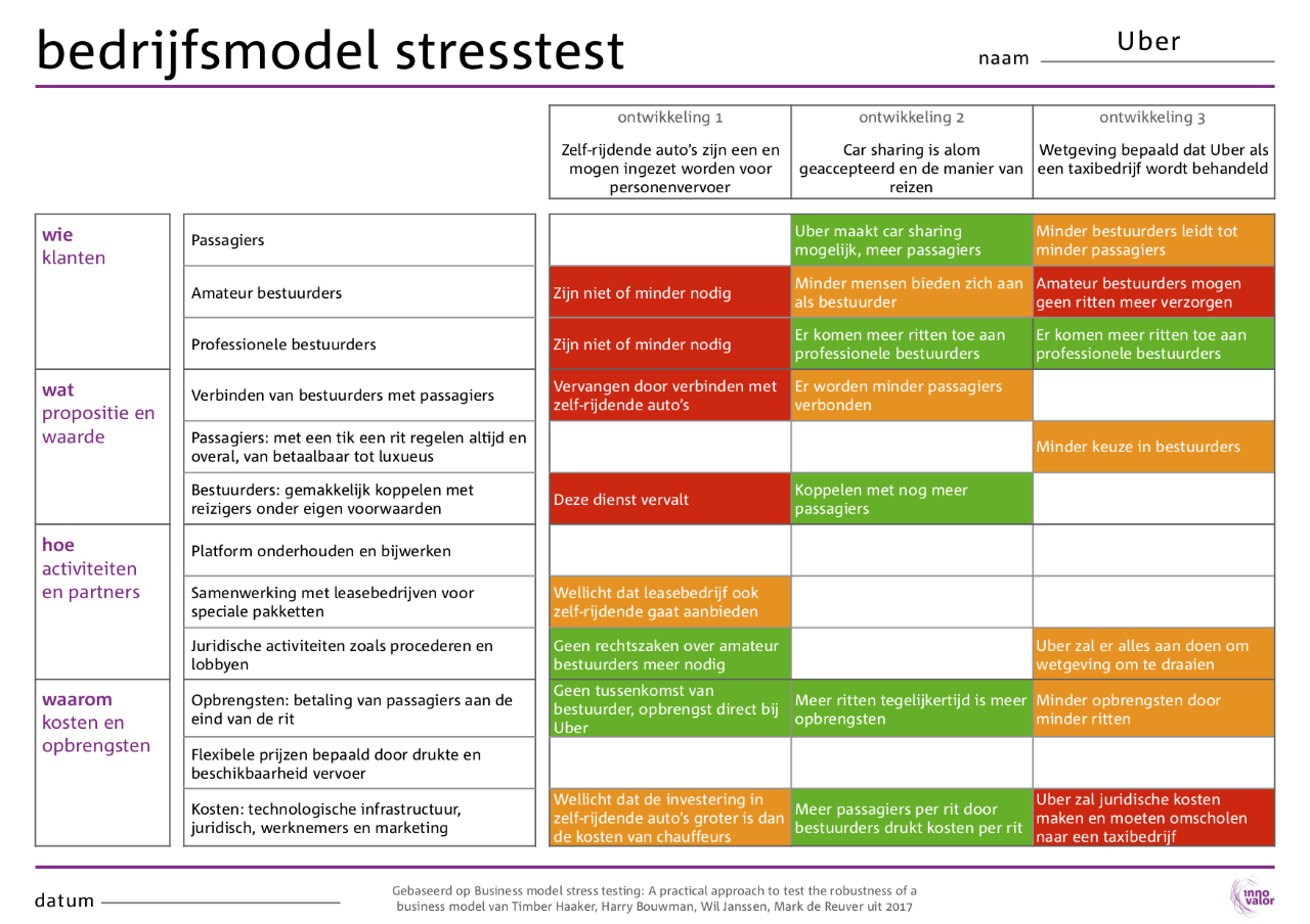 Print de Bedrijfsmodel Stresstest op een grote poster. Ter inspiratie kun je kijken naar de Bedrijfsmodel Stresstest voor Uber.