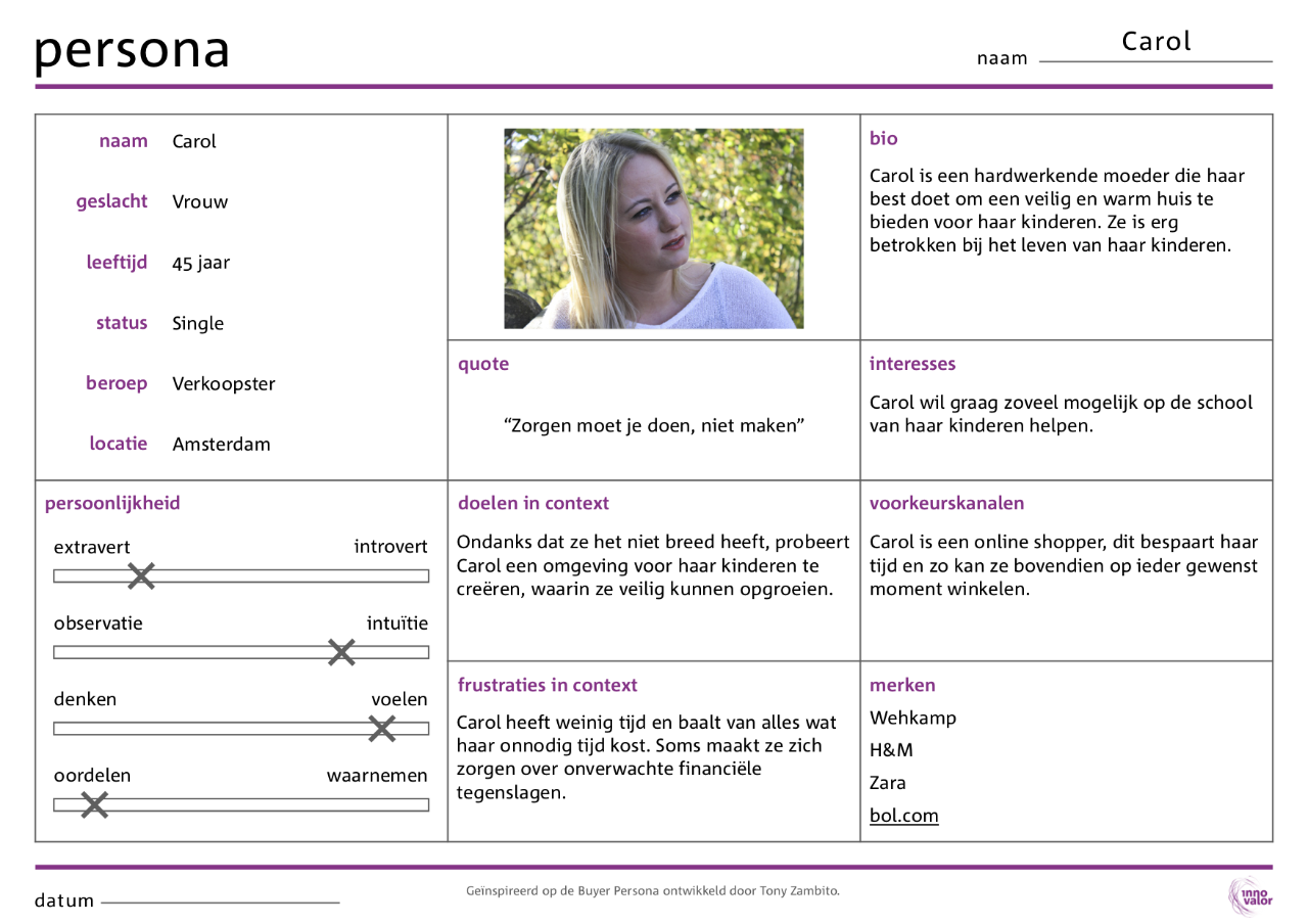 - Persoonlijkheid: is jouw Persona introvert of extravert? Maakt hij/zij afgewogen beslissingen of op basis van zijn intuïtie?