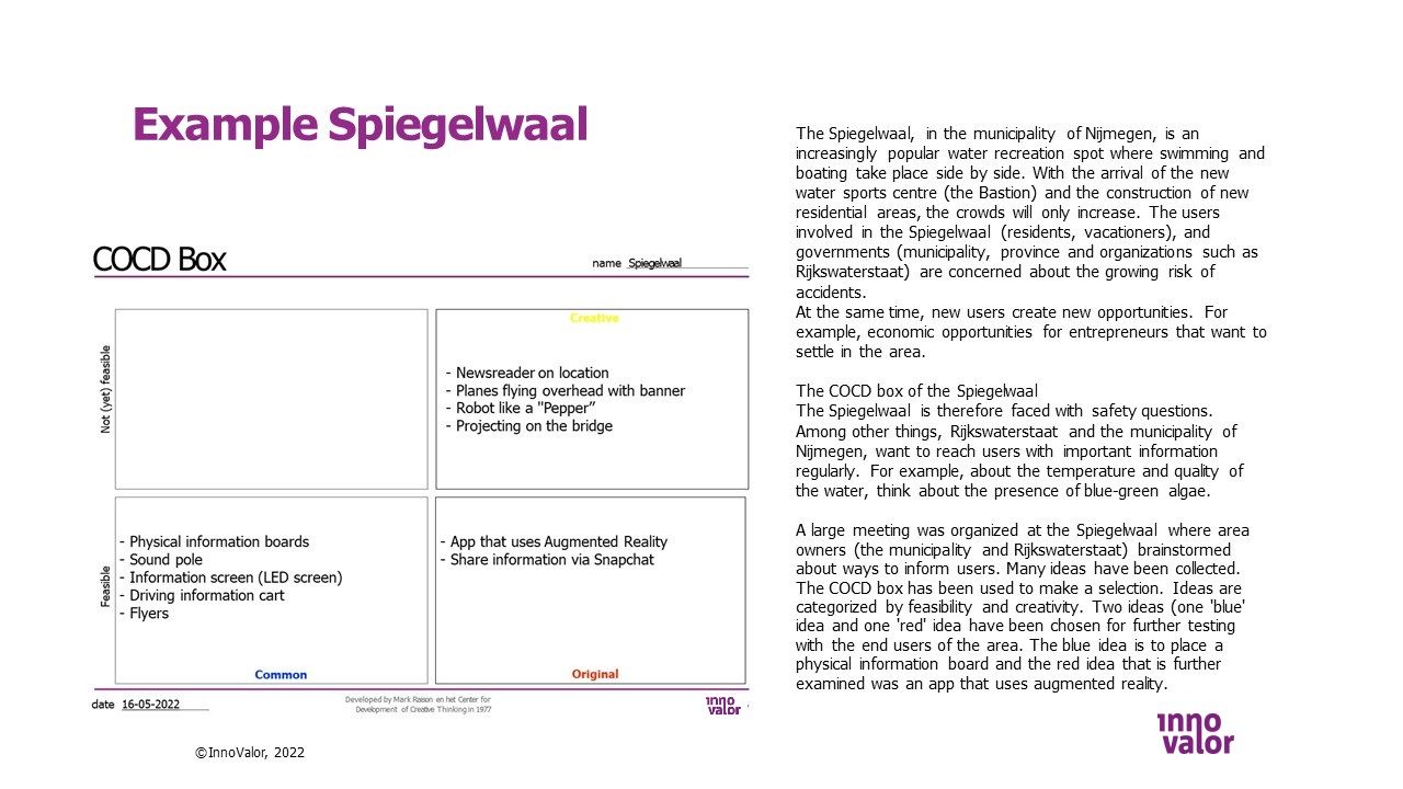 You start the work session with a presentation in which you explain the context from which the list of ideas emerged. Also, make sure you take the participants into the context of your project. You could do this in a presentation and end up presenting the numbered list of ideas. Numbering the ideas is important so that you can easily continue working at step 2 without having to completely copy the ideas. Explain the different quadrants of the COCD Box. The canvas consists of: