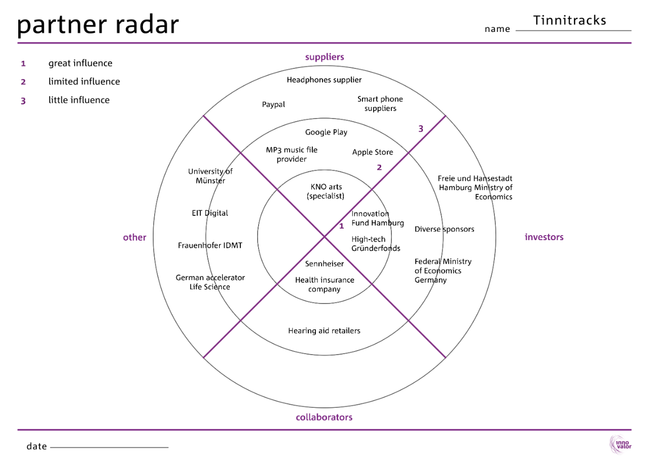 Make a large printout of the Partner Radar to use in a brainstorm. Have a look at the example of Tinnitracks to get a better understanding of what a Partner Radar can look like.